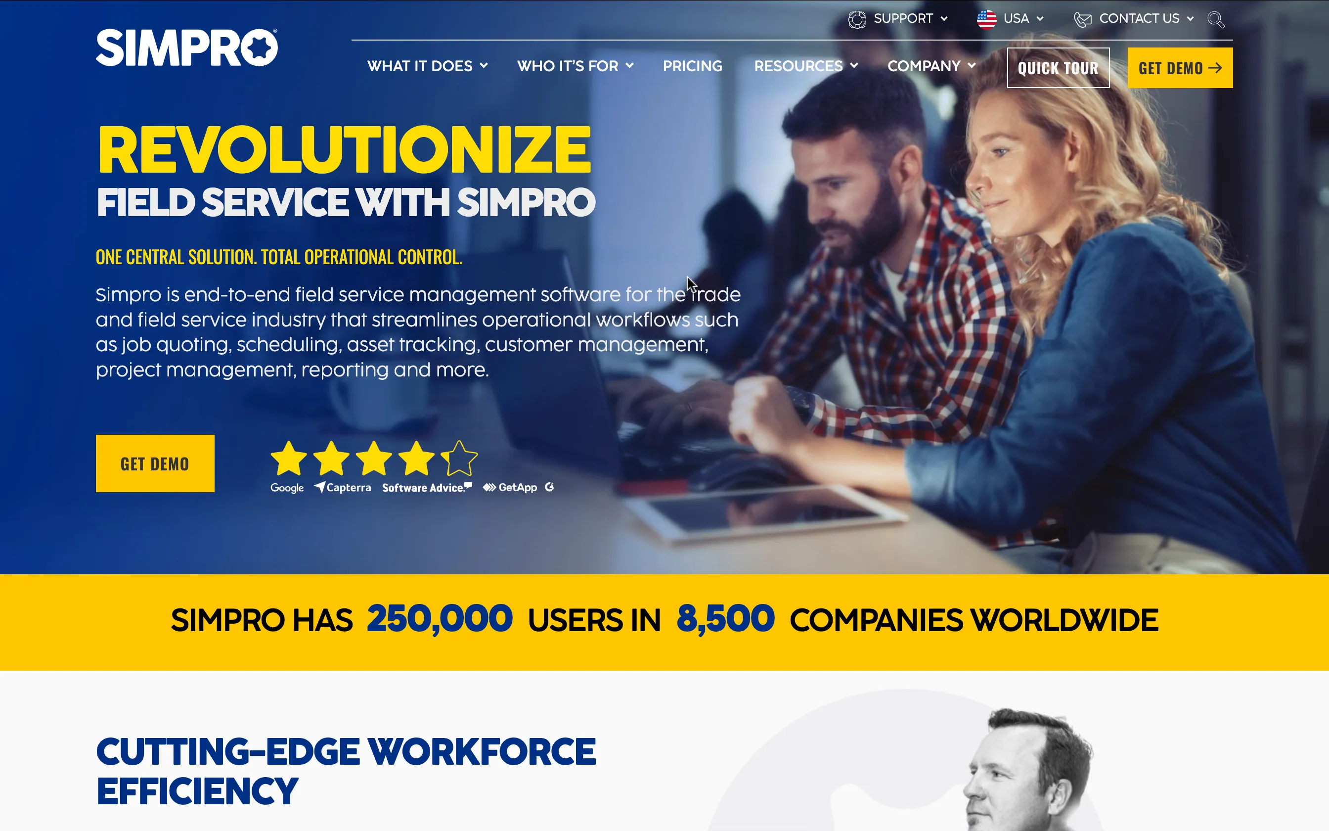 Simpro blends FSM with quoting, inventory, and costing tools — making it a smart fit for trade services. It supports preventive scheduling and asset logs, though full functionality may require paid add-ons.
