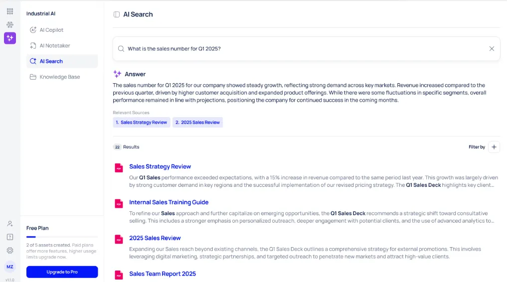 For example, a technician in the field might type, “What’s the torque setting for the drive motor on model X120?” Instead of scrolling through manuals or calling support, the system instantly pulls the answer from connected service documents, shows the exact source file, and highlights the relevant section.