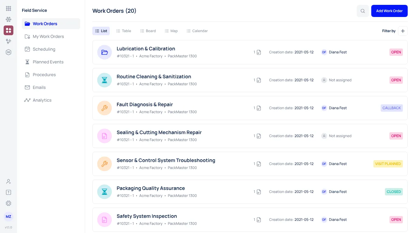 - Work order management with automated status updates