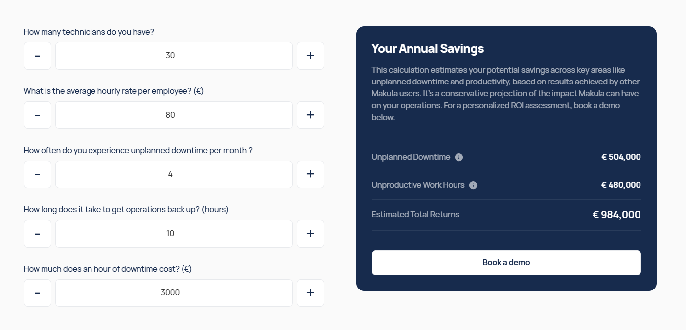 Using an intelligent maintenance platform like Makula makes this effortless. By centralising your asset data and tracking every work order, you can automatically generate the reports needed to prove your ongoing success to the board. You can easily compare your actual savings against your initial calculator projections.