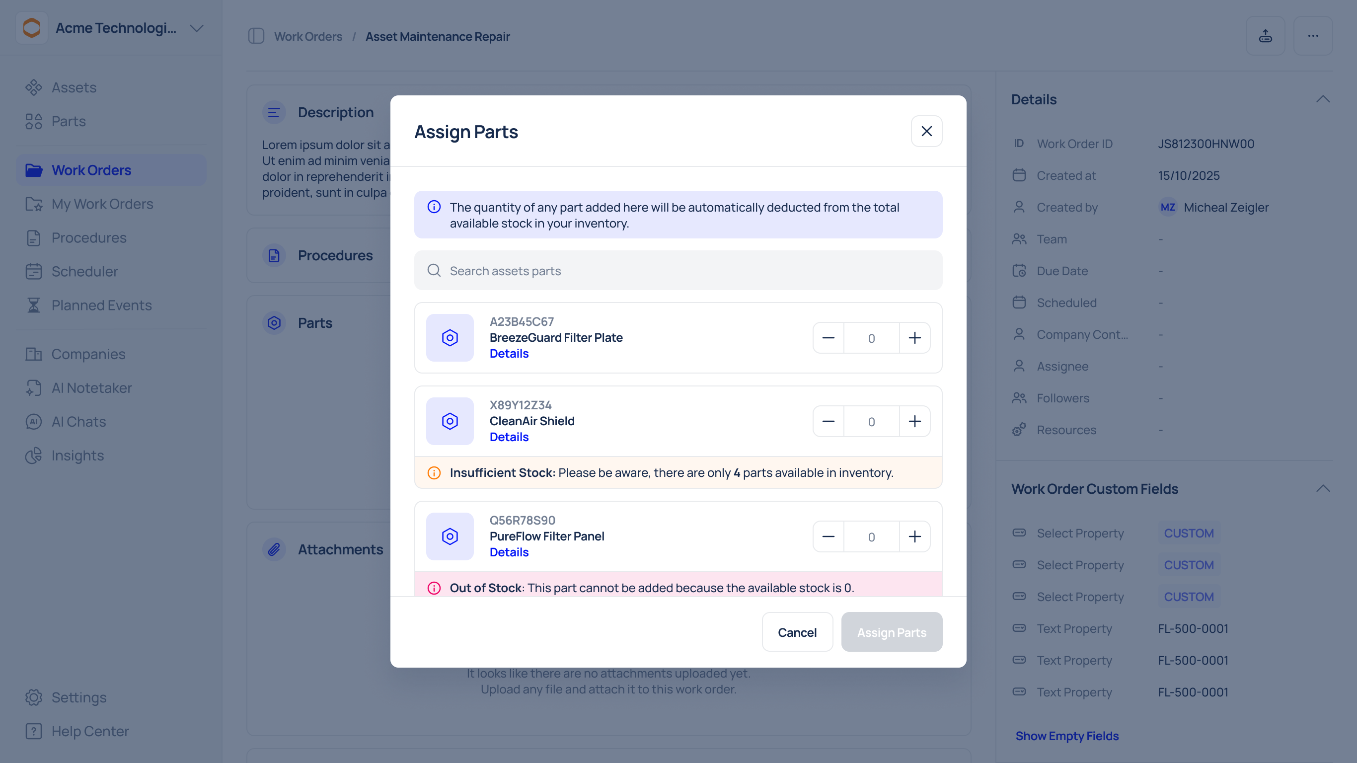 Makula is mobile-first and works even offline, allowing technicians to issue or return parts directly from the shop floor. It is well-suited for manufacturing, healthcare facilities, and multi-site operations that need tight integration between maintenance and inventory in one system.
