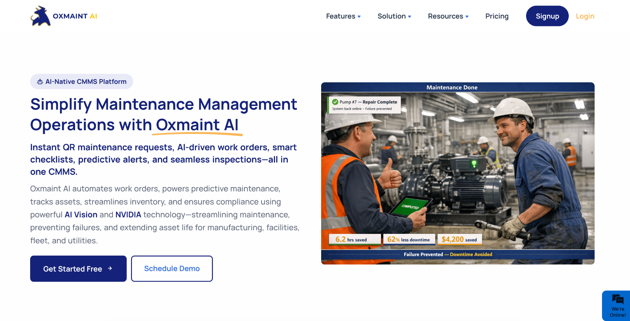 OxMaint covers preventive maintenance, inspections with digital checklists, parts and inventory tracking, safety compliance, and analytics.