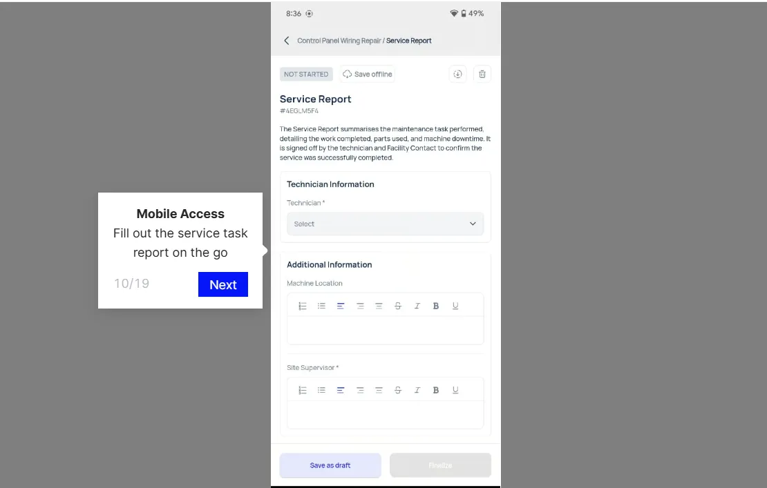 In practice, this means a technician at a remote site can finish the job, record every detail, and move on to the next task without waiting for a signal.