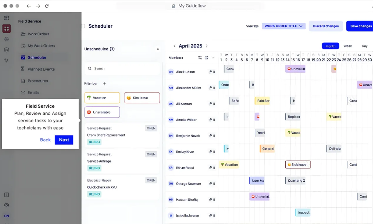 Select technician scheduling software that scales with your service network. As you expand your installed base, add regions, or diversify machine types, your system should support larger technician teams, more asset categories, and complex job flows.