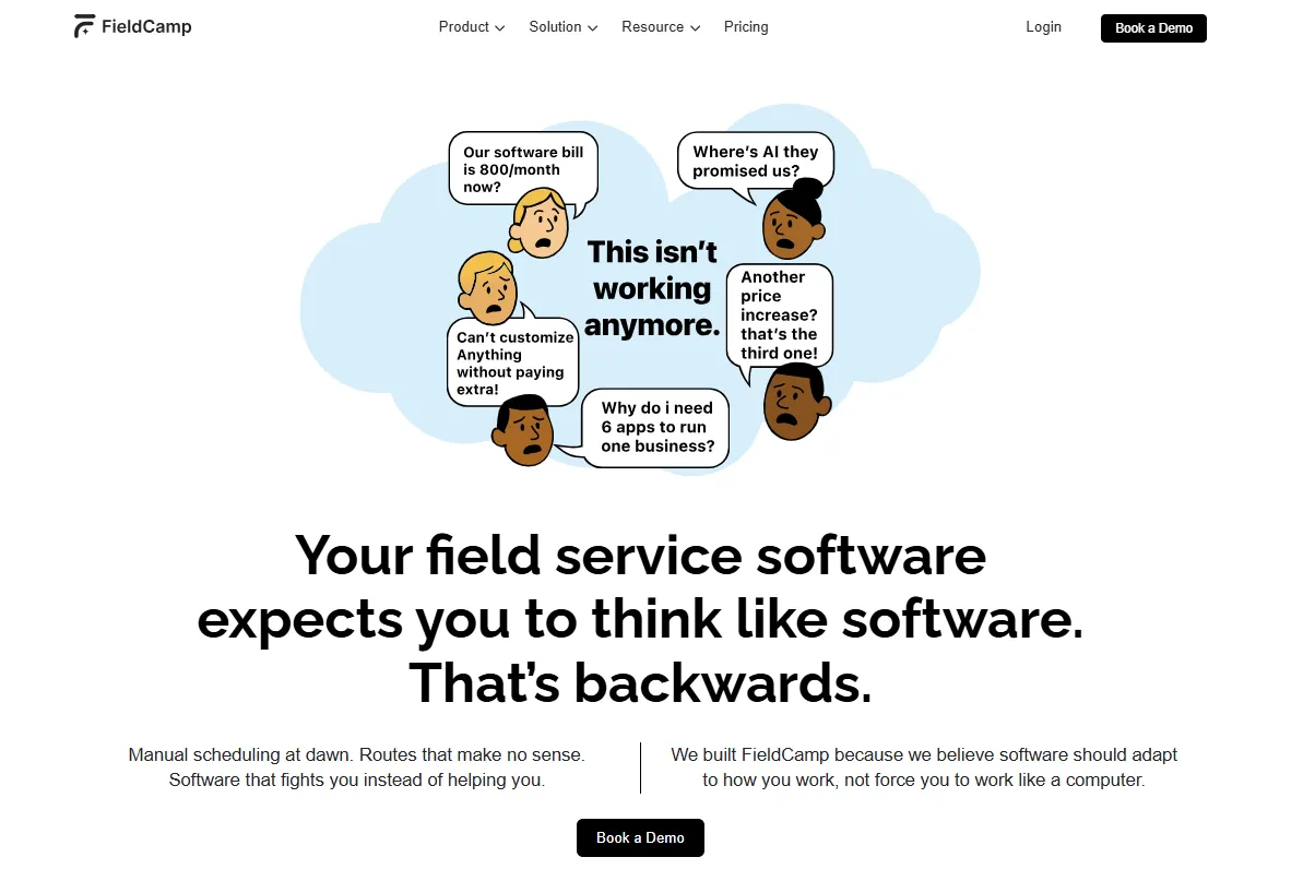 FieldCamp AI job scheduling, smart routing, digital checklists, CRM, inventory tracking, recurring jobs Starts at $39 per user/month ⭐ 4.6/5