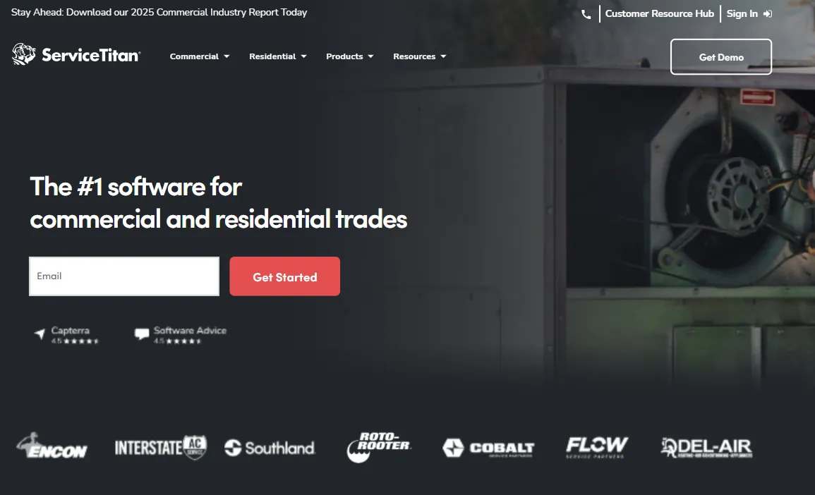 ServiceTitan Dispatch board, skills/zone matching, accounting & inventory tools, 70+ integrations, performance analytics Plans: Starter, Essentials, The Works (Contact for quote) ⭐ 4.7/5