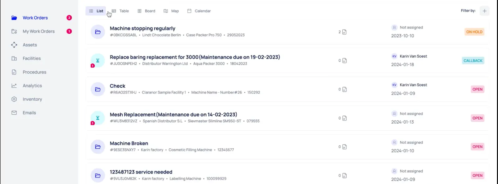 - List View: Best for quickly scanning all open work orders. It can be helpful at shift handovers, enabling the next manager to know which work orders are due, pending, or overdue, so they can prioritise tasks.