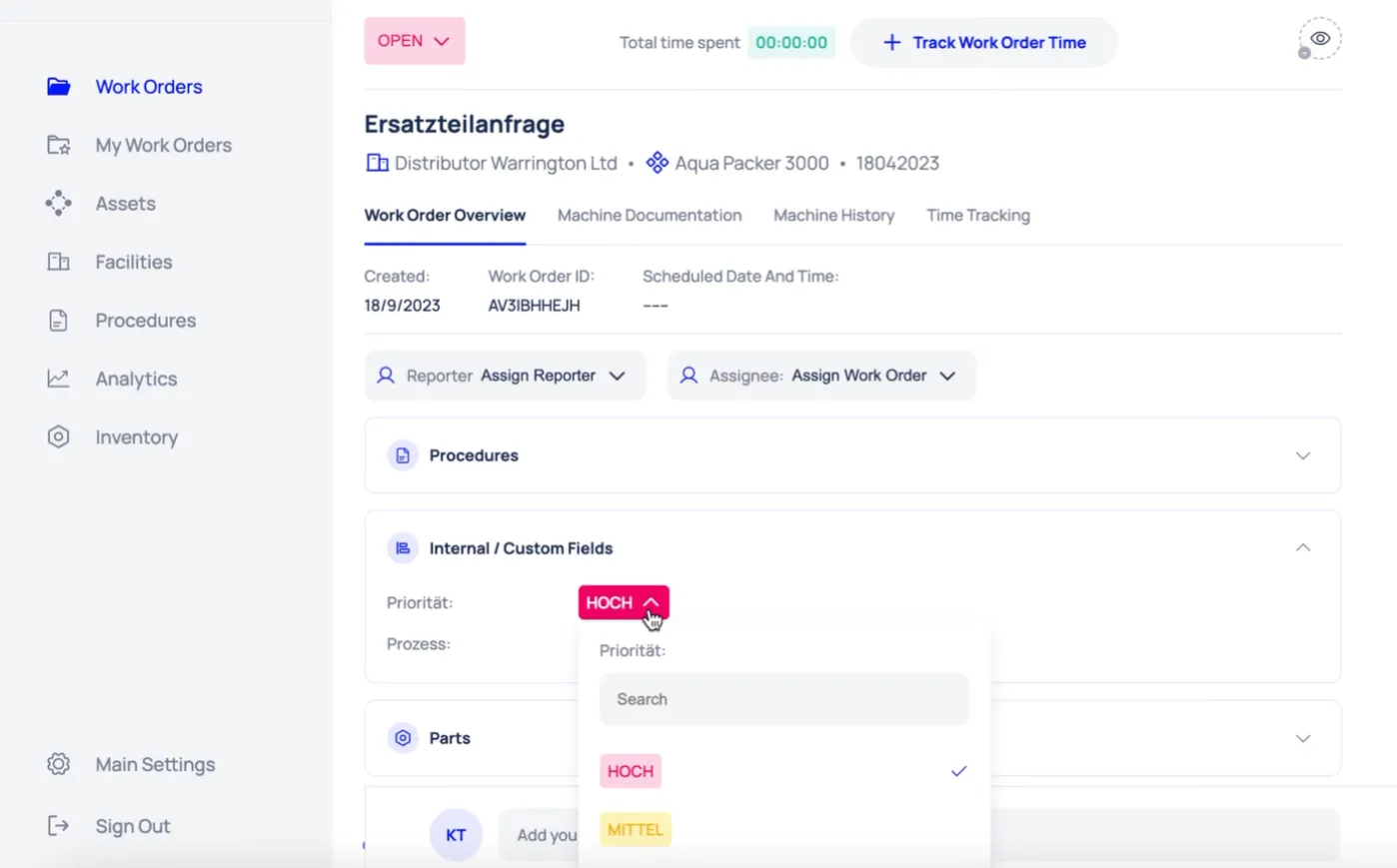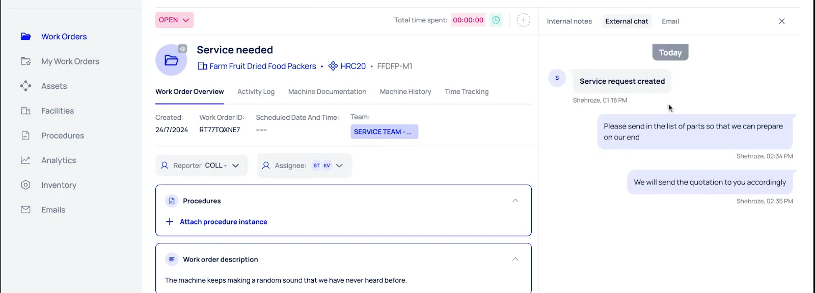- Built-In Chat: Technicians can instantly notify supervisors about unexpected faults and request extra spare parts, speeding the resolution.