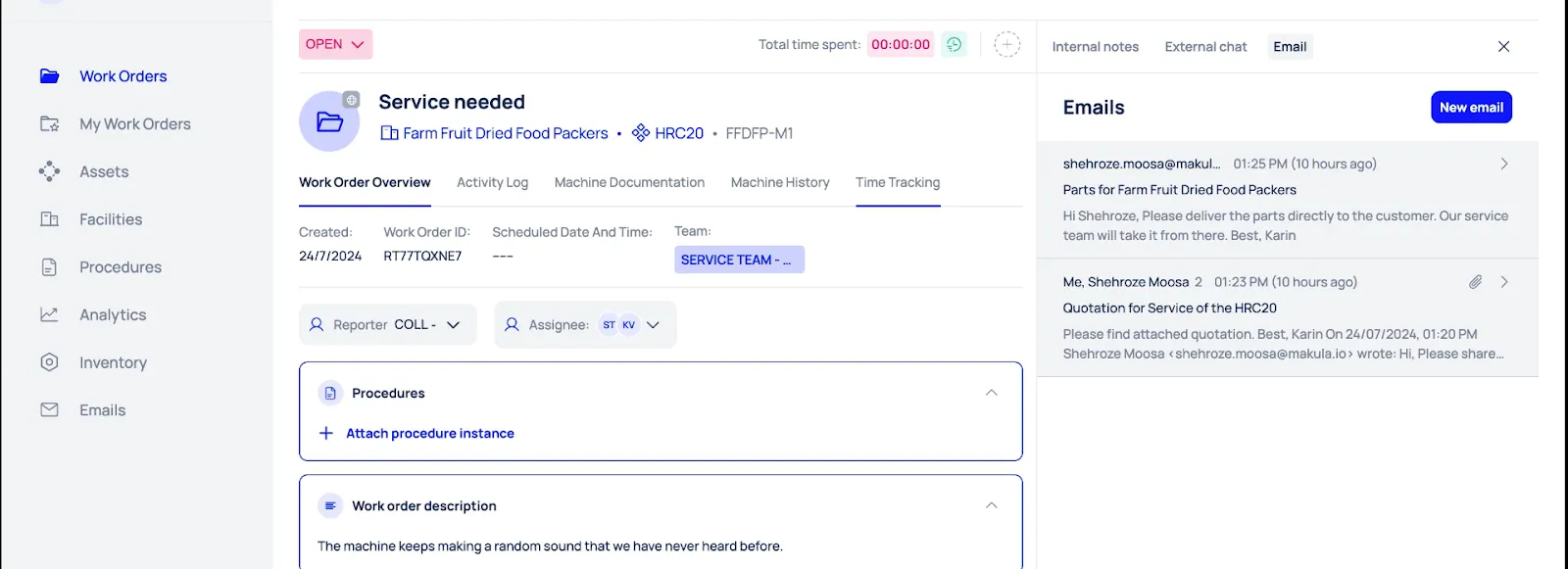 - Emails: Service managers can review and reply to customer emails within the same work order, keeping client communication relevant to a specific machine issue.