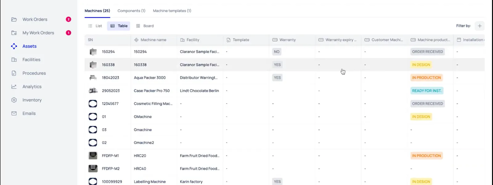 - Table View: Ideal for detailed analysis. Managers can filter and sort work orders by asset, priority, or custom tags, to identify failure patterns and plan parts inventory.